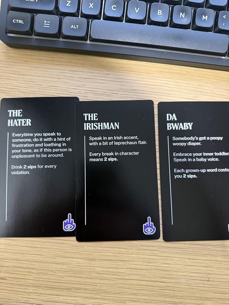 This game exists somewhere on the spectrum of a fun get together with friends to completely unhinged night in. If that level of chaos and uncertainty is something you’re into, then this game is absolutely for you. The rules are rather simple but the complication and variation comes in the tasks on the cards. One can probably go through the deck of cards and think oh what fun to damn that’s nasty. I took a couple of pictures of my favorite ones but there were a few that I would be worried if my account would be banned for obscenity. I doubt you’re playing a drinking game with someone uptight but I would certainly not recommend playing this with people who would not be able to take a joke or hold their liquor.The premise of the game is quite simple. You play command cards that the game calls Gadgets. These usually have some action and some system for taking drinks. Sometimes the Gadgets will call for more consequential cards to be drawn called omens. Pretty straight forward and the chaos really revolves around the actions themselves.I would also think you’re not playing this with anything but beer. The amount of sips you’ll be taking would having most on their backs if their drinking cocktails with this much speed. Good luck to you otherwise.